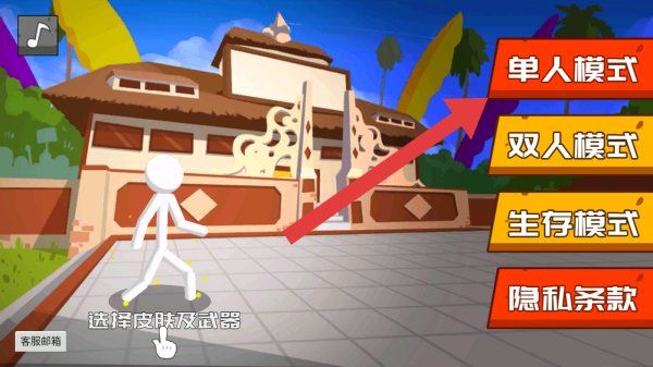 2、可选择皮肤、武器、颜色自定义火柴人外观,点击开始进入游戏,延续火柴人题材风格。
