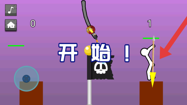 3、画面显示开始!,有两个火柴人角色分别持不同武器,界面含音乐、主页图标,呈现对战即将开始的场景。