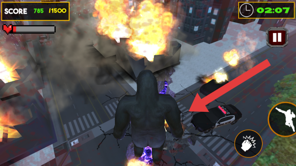 3、呈现巨型大猩猩怪兽在城市中破坏场景,有分数、时间、血量等显示,还有警车、爆炸特效,体现怪兽肆虐城市的玩法。