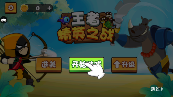 1、界面元素:选关、升级按钮,还有金币显示、设置图标、跳过按钮以及持弓箭的玩家,点击开始游戏方可进入。