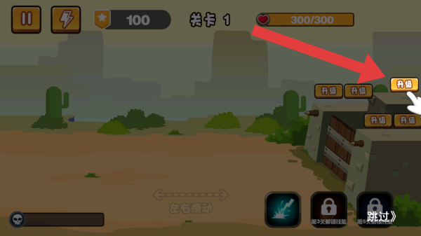 2、关卡为关卡1,有血量目前是300/300,点击升级的按钮方可升级士兵,场景是荒漠风格有仙人掌、植被、建筑。