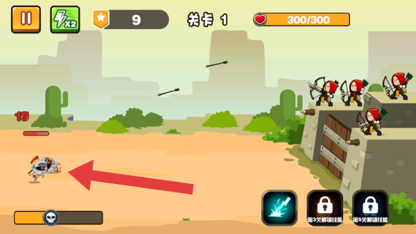 3、将士兵放置在城墙上进行攻击慢慢靠近的敌人,场景是荒漠风格有仙人掌、山石、植被。