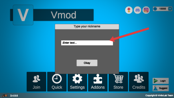 1、在Type-your-nickname输入框输入昵称,点击Okay确认,完成身份设置进入Vmod游戏。