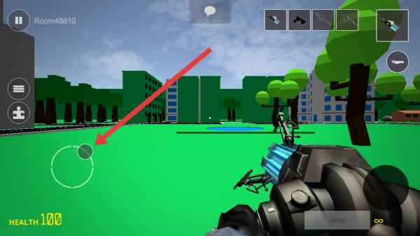 3、在进入游戏场景后,移动屏幕中左侧虚拟摇杆,控制角色在绿色场地行动,参与对战。