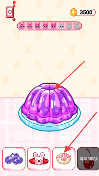 3、在果冻制作界面,根据等级解锁情况,选择如蓝莓、兔子装饰等装饰元素,对紫色果冻进行装饰,提升果冻吸引力,推进游戏任务。