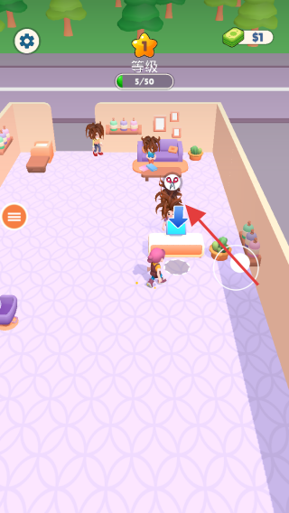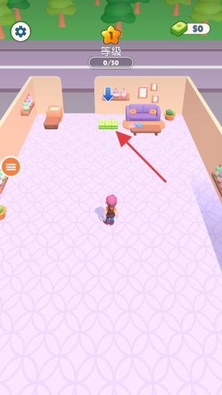 1、在游戏场景中,操控角色移动到带有向下箭头标识的金钱处,点击收集,获取金币,积累游戏资金,用于后续升级或购买道具。
