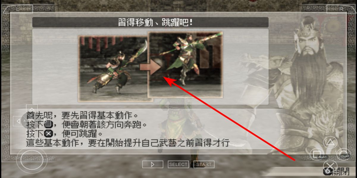 2、进入教学界面,跟随习得移动、跳跃吧指引,按下对应按键让武将朝指定方向奔跑,再按跳跃键触发动作,熟悉按键与行动的关联。