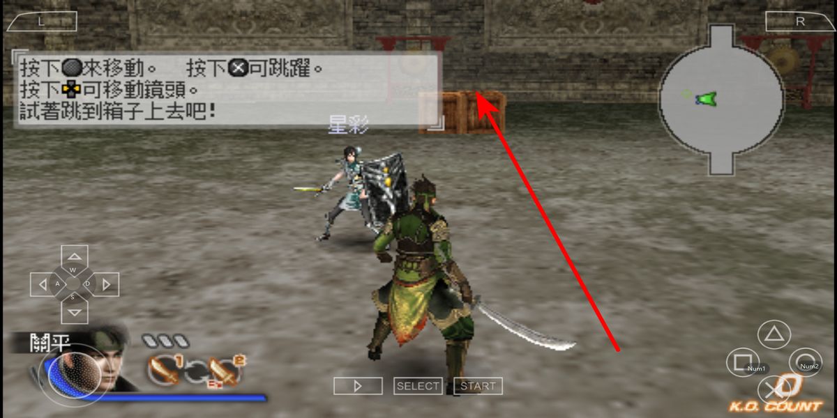 3、操控关平,按下移动按键,朝箱子方向奔跑,途中可按方向键微调路径,确保角色移动轨迹对准箱子,靠近箱子时,看准时机按下跳跃按键。