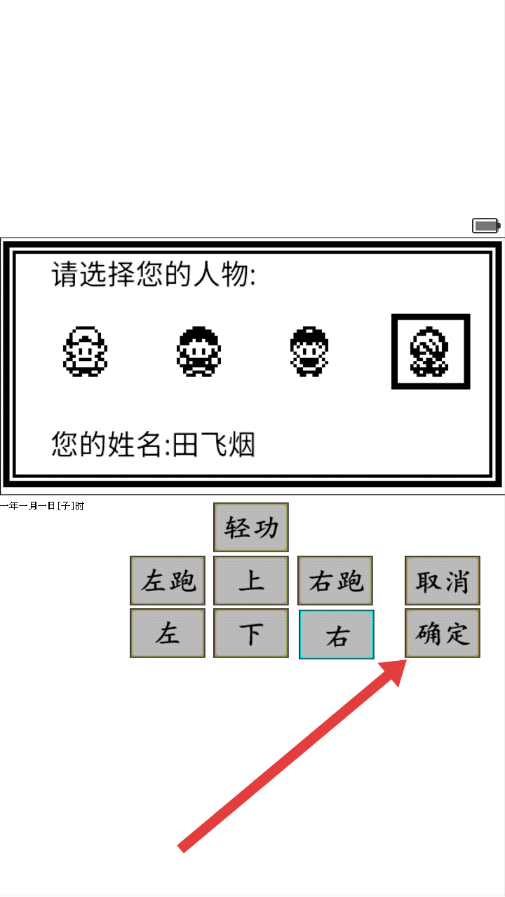 2、角色选择界面提供4个像素风格角色可选,选定自己的角色后,界面显示默认姓名田飞烟。