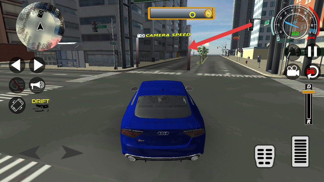 2、在驾驶中留意上方CAMERA SPEED提示,通过虚拟按键微调视角,确保前方道路清晰可见,辅助精准转向。