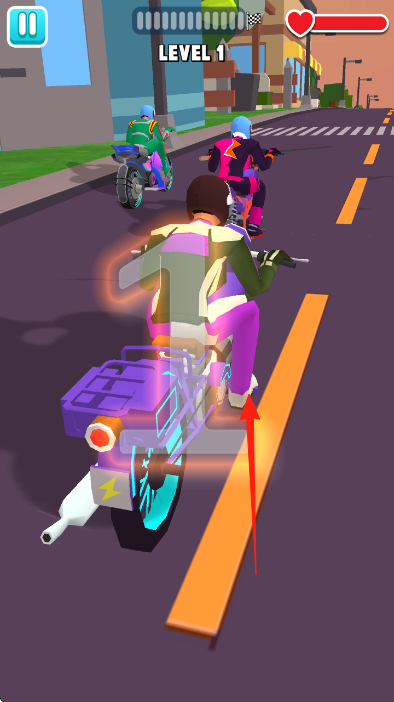 1、关卡1开始,点击箭头指向的角色脚部区域,让摩托车快速起步,跟上前方对手。