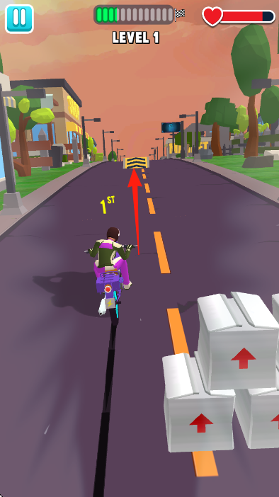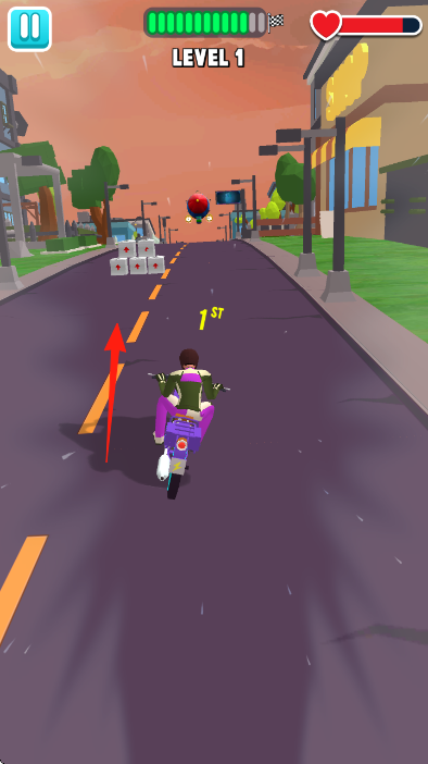 3、面对新出现的路,根据箭头指向,灵活操控摩托车左右移动,精准躲避,持续向终点冲刺。