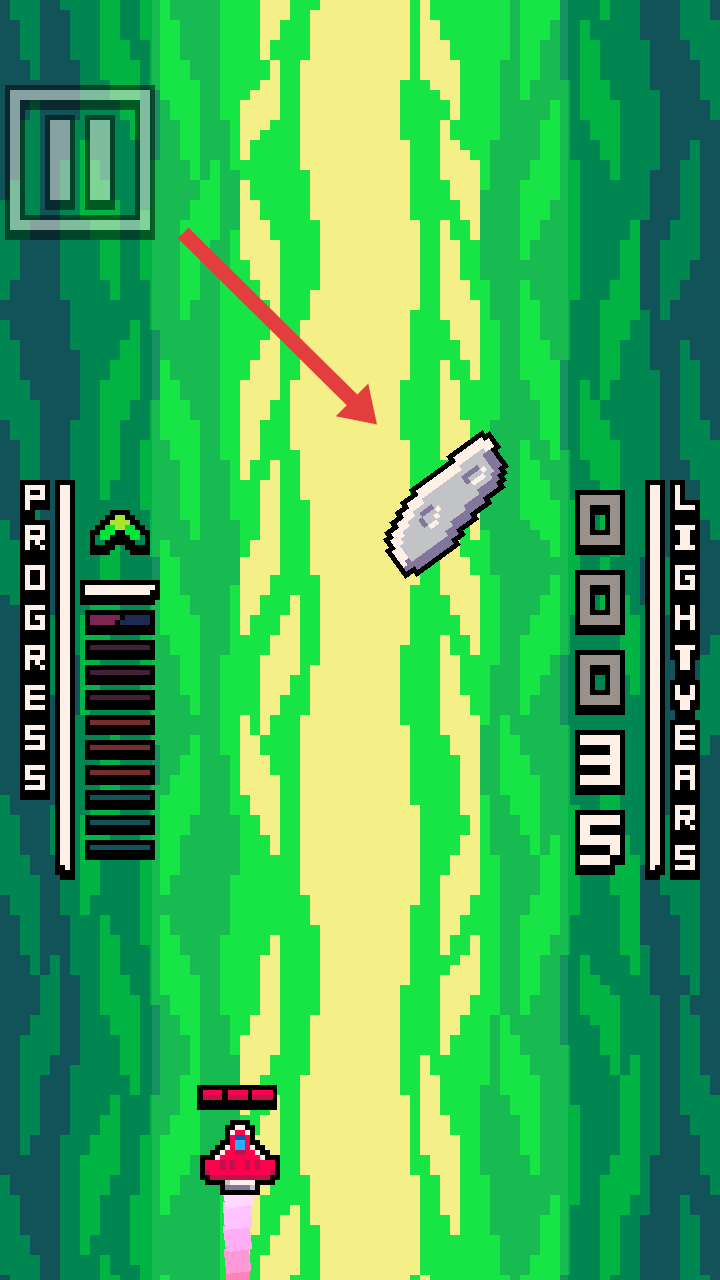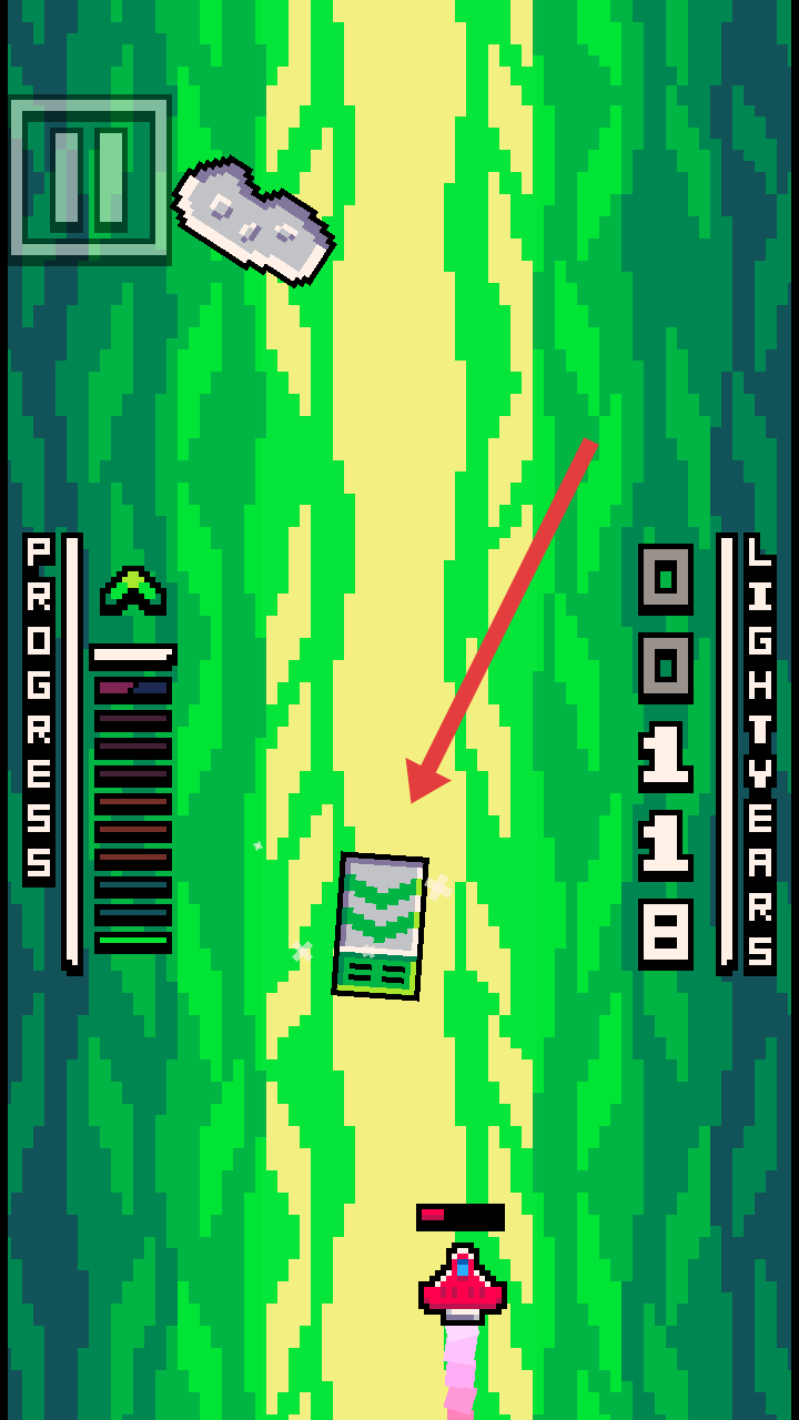 1、操控底部红色战机,灵活闪避场景障碍,就比如这个关卡场景中的灰色大石块,遇到它需要进行躲避。