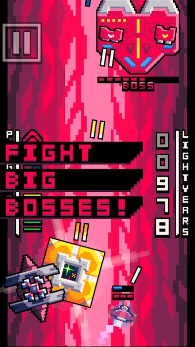 1、音画协同机制:以像素画风结合音乐节奏构建玩法,太空场景与战机动作随音乐节奏变化,躲避小行星与射击时机贴合旋律,让飞行射击在协同中更具沉浸感。