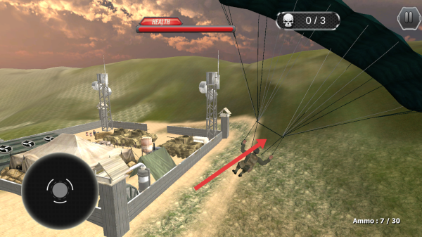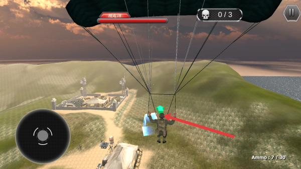 1、进入游戏页面后,操作跳伞,用左侧摇杆微调方向,瞄准军事基地有坦克、建筑区域。