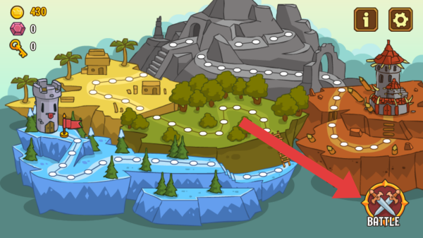 1、能看到不同地貌场景,如城堡、冰山、森林等区域,界面右下角有标着BATTLE的按钮。