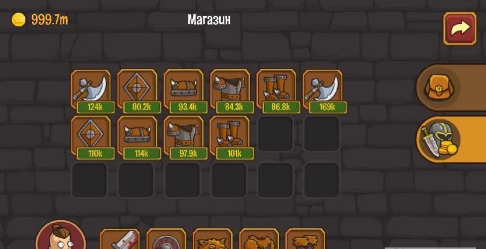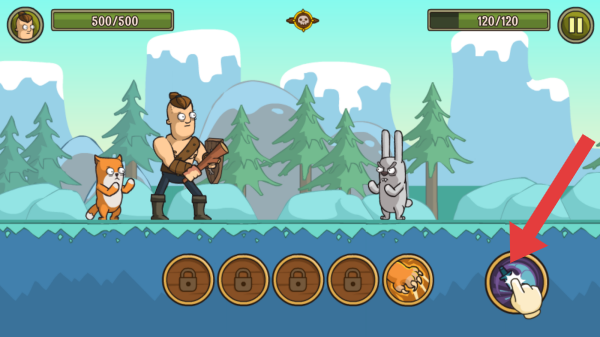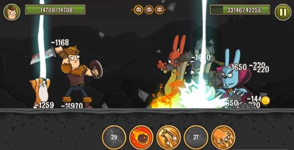 2、画面中有手持武器和盾牌的玩家,上方显示了两个角色的生命值数值,下方是技能或道具选择按钮,有一个按钮上有手指点击的指示。
