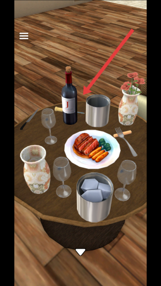 1、进入游戏场景,点击查看餐桌场景,点击箭头指向的红酒瓶,会发现红酒瓶上贴着J的字母,可能是某种线索。