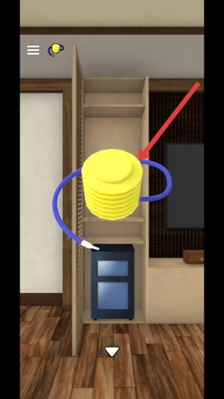 3、聚焦橱柜的场景区域,需要点击箭头标记的黄色物件,结合蓝色软管互动,完成操作解锁新内容。