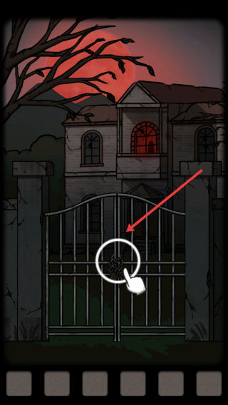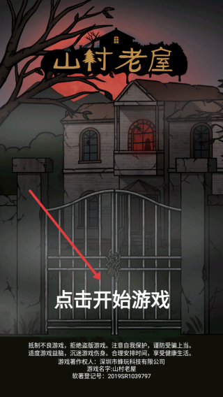 1、点击开始游戏,进入山村老屋场景,观察环境细节,尝试点击铁门等互动,开启解谜。