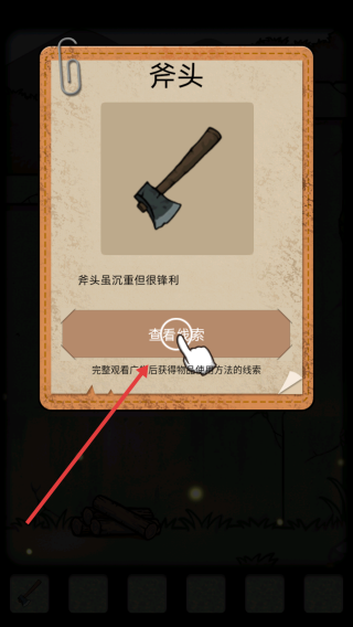 2、收集斧头道具,点击查看线索,获取解谜提示,依据线索找场景关联,破解机关。