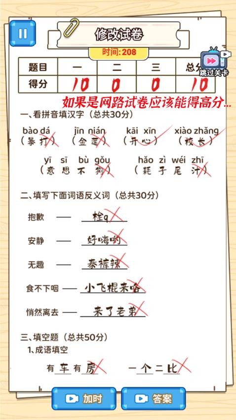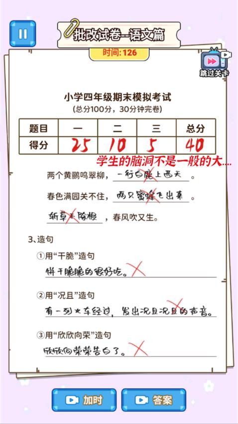 3、限时挑战玩法,在规定时间内完成批量阅卷。保持高准确率可激活连击奖励,失误过多则会触发家长投诉惩罚机制。