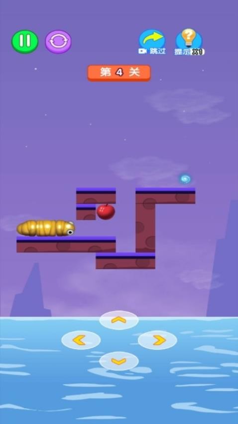 1、开始游戏后先观察关卡地形,找到通往苹果和蓝色小球的路线,规划好蠕动方向,避免绕远路或掉下平台。