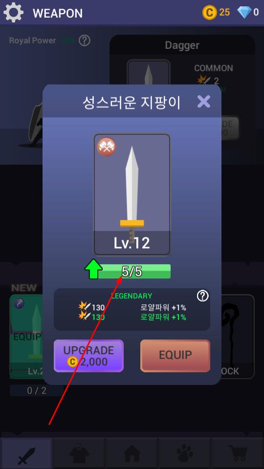 3、进入武器界面,留意武器升级进度如Lv.12剑的5/5进度,花费金币点击UPGRADE提升属性。