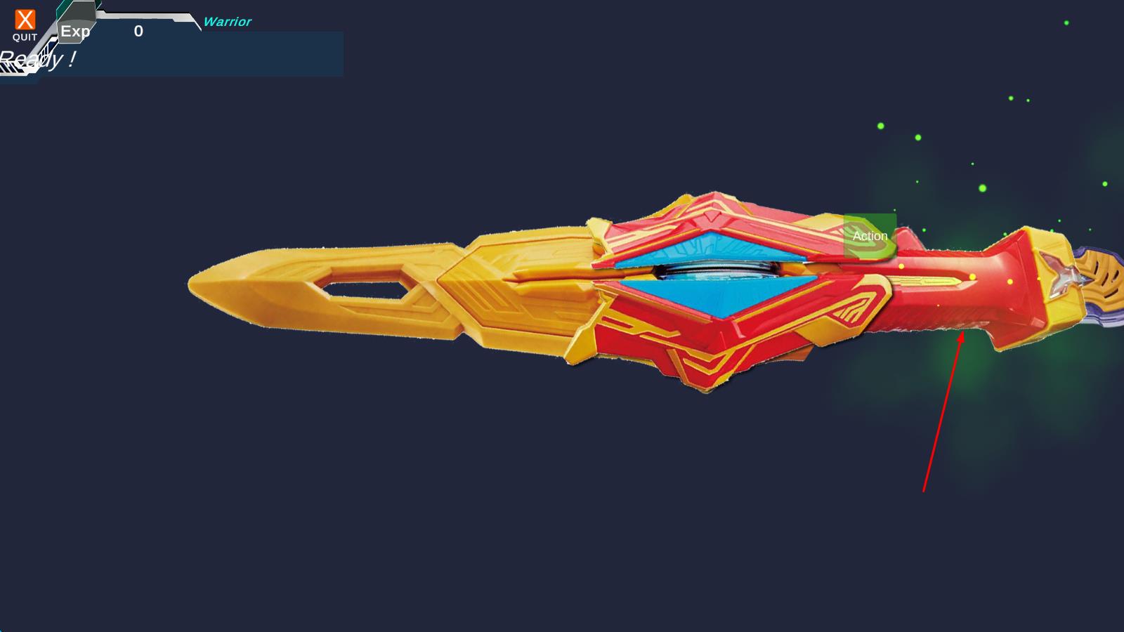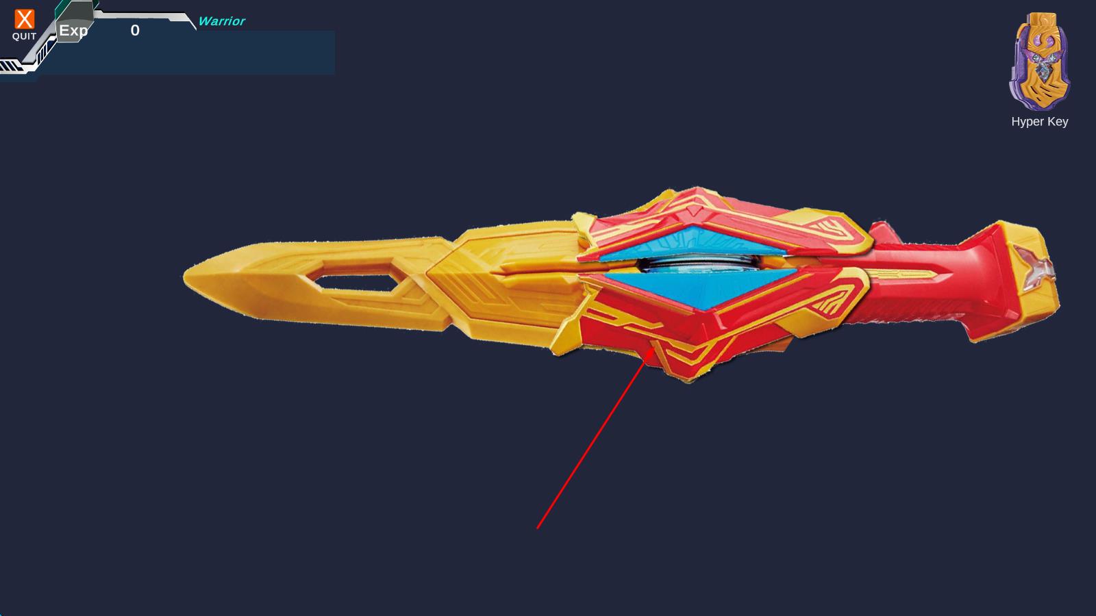 1、打开游戏,屏幕中央横放着处于特利迦模式剑格收束的奥特二重剑,插入奥特次元密钥,点击右侧按钮启动武器。
