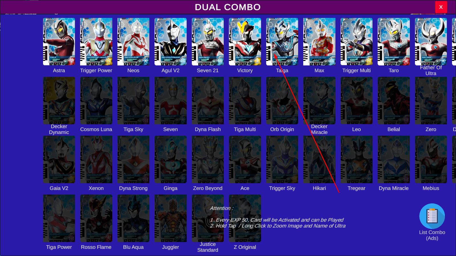 2、启动后出现奥特次元卡盒,先刷特利迦卡牌获取经验,点击攻击按钮施展技能,再点击中部切换至德凯模式,刷对应卡牌加速积累经验。