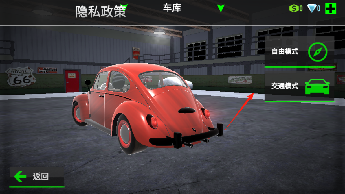 1、在车库界面选交通模式箭头指向,进入有交通规则限制的驾驶场景,体验真实路况。