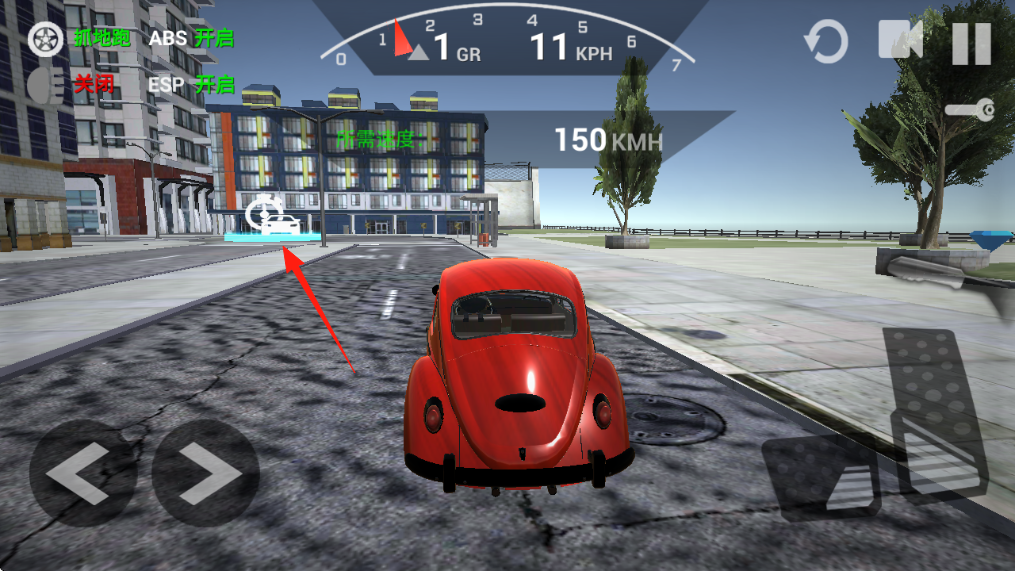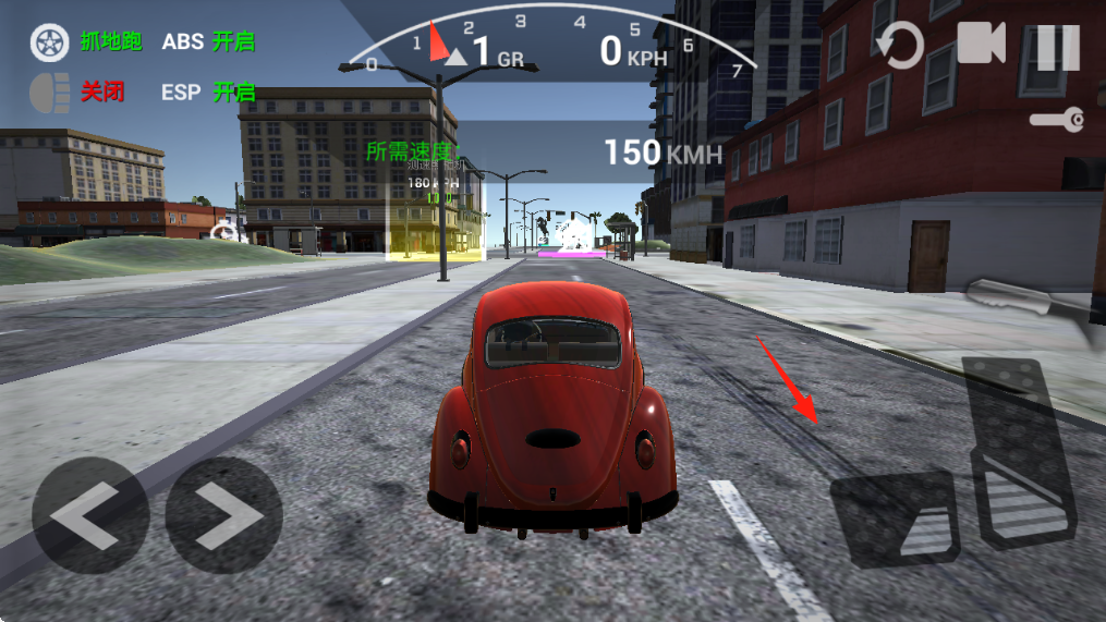 2、进入驾驶界面,点击右侧油门按钮箭头指向,让红色甲壳虫汽车起步,在道路行驶。