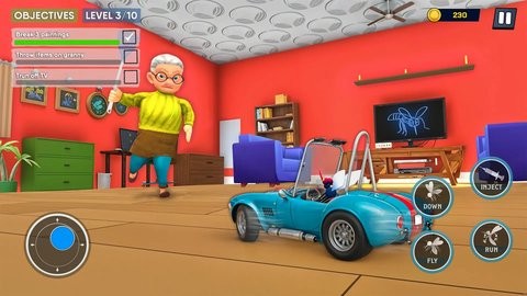 3、躲避可怕的老奶奶,她会使用蚊虫拍、杀虫剂等各种武器对你灭杀。