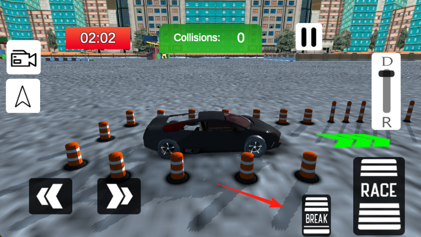 2、行驶中,若要减速或微调位置,点击BREAK刹车按钮箭头指向,避免碰撞路锥。
