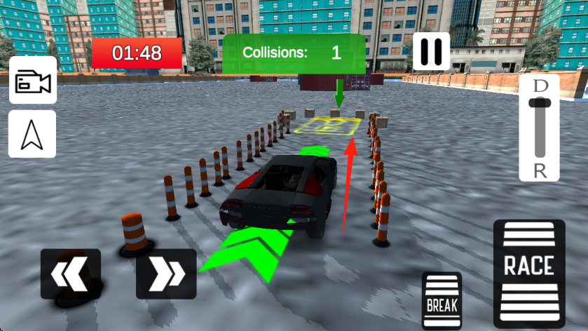 3、沿绿色箭头指示路径,驾驶汽车向箭头指向的黄色区域停车点行驶,注意躲避路锥,完成停车挑战。