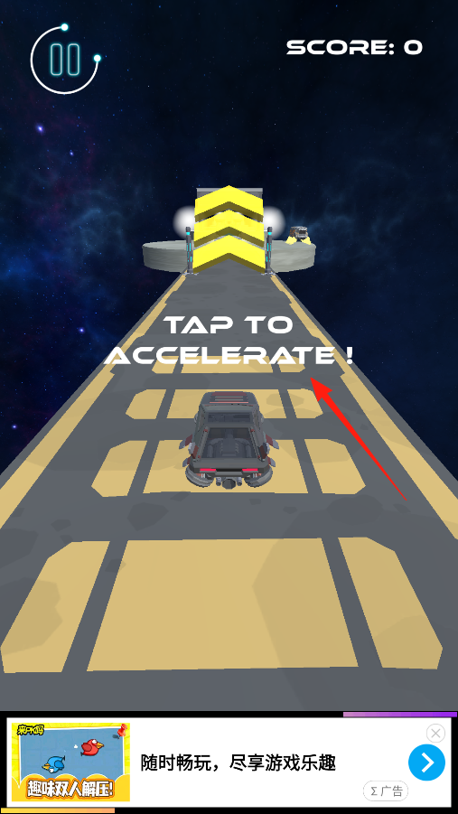 2、进入太空赛道,太空车在黄色轨道上待命,点击TAP TO ACCELERATE,给太空车加速,冲过轨道上的障碍和坡道,每一次点击加速,都能让车飞得更远,要把握时机。