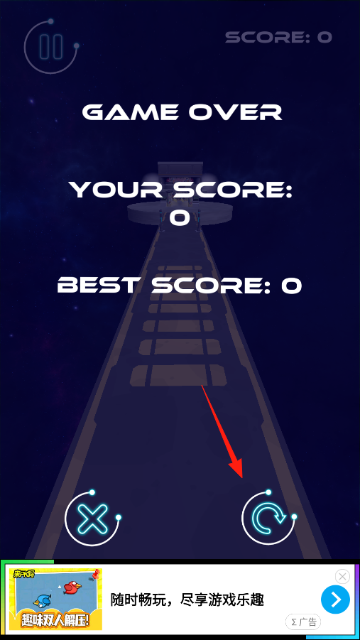 3、游戏失败后,看到GAME OVER界面,点右下角的重置按钮,重新开始挑战,调整操作节奏,让太空车在轨道上更稳更快,不服输就再来一局,优化加速时机,避开障碍。