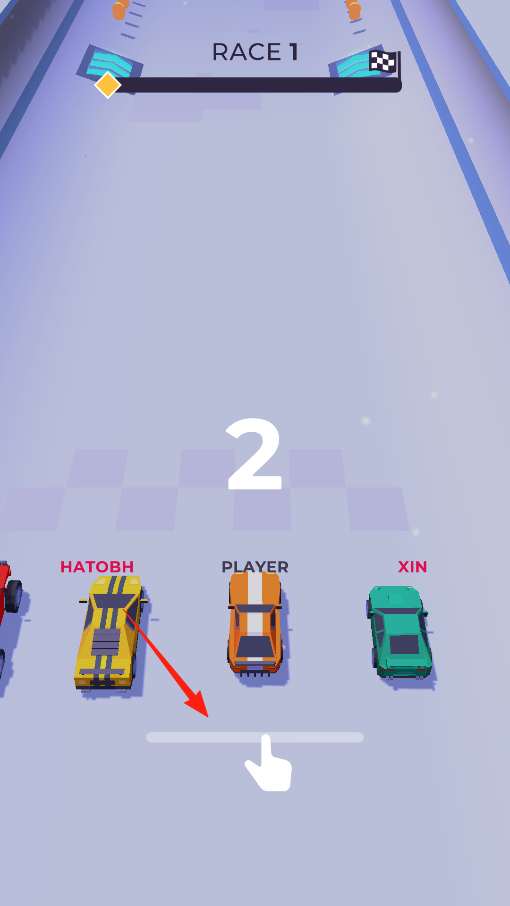 2、进入RACE1赛前准备,三辆赛车同场待发,按提示长按屏幕进行蓄力操作,随着倒计时归0,松开手指让赛车如离弦之箭冲出起跑线,这一环节讲究蓄力节奏。