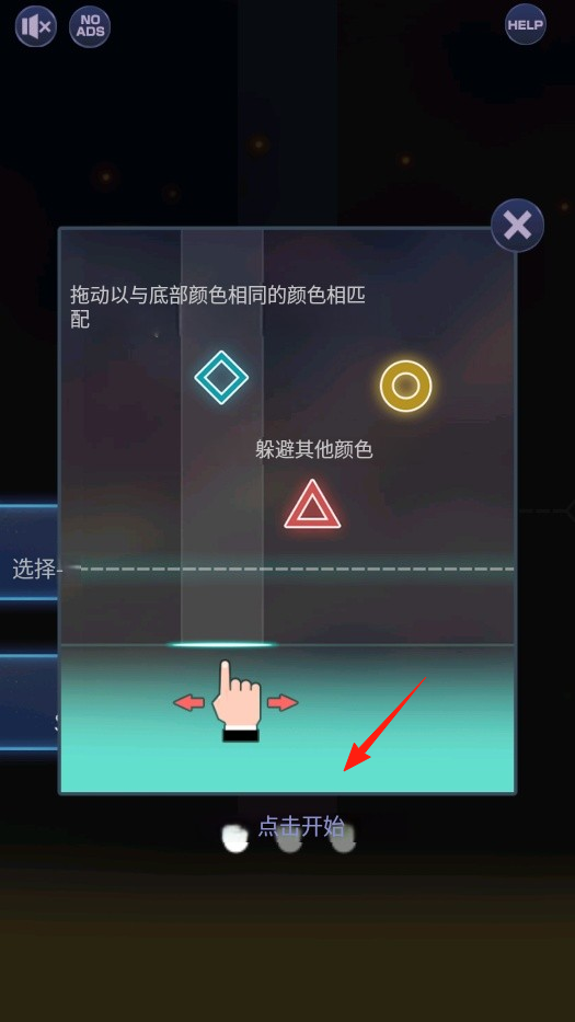 1、进入游戏说明界面,能看到不同颜色和形状的图形,底部有操作指引,点击点击开始,正式开启挑战,游戏中要拖动图形,让其颜色和底部匹配,同时躲避其他颜色图形。