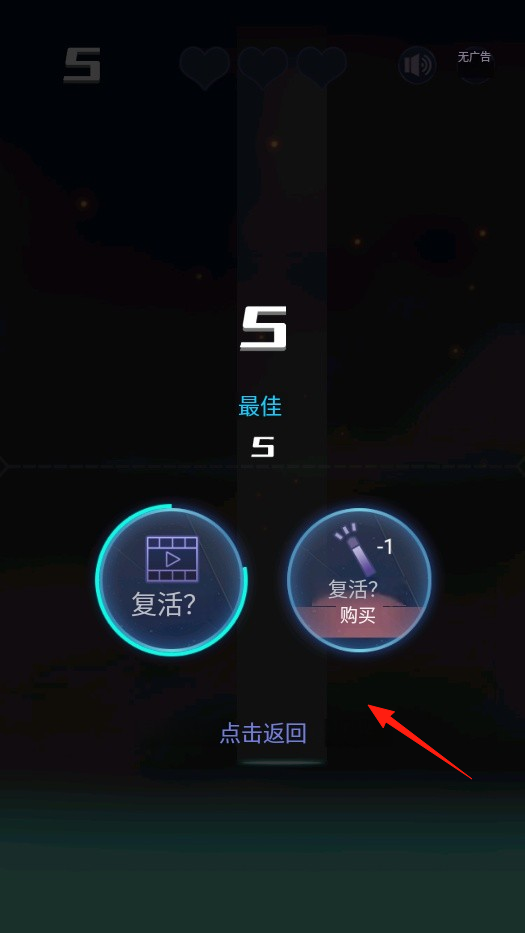 3、挑战失败后,出现结果界面,显示当前和最佳成绩,可选择复活看广告继续,或复活购买消耗道具重来,也能点击返回退出,若选复活,需把握机会,修正之前失误。