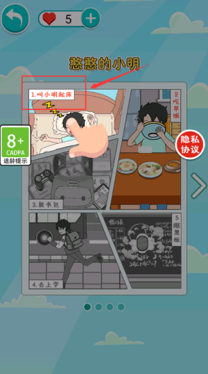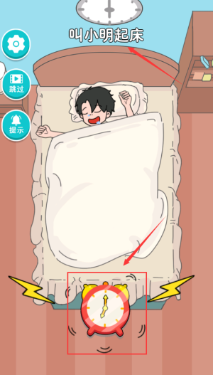4、点击红色闹钟,叫醒睡觉的小明起床。