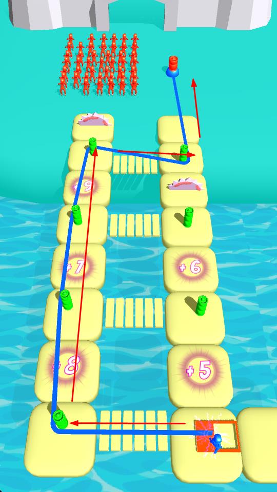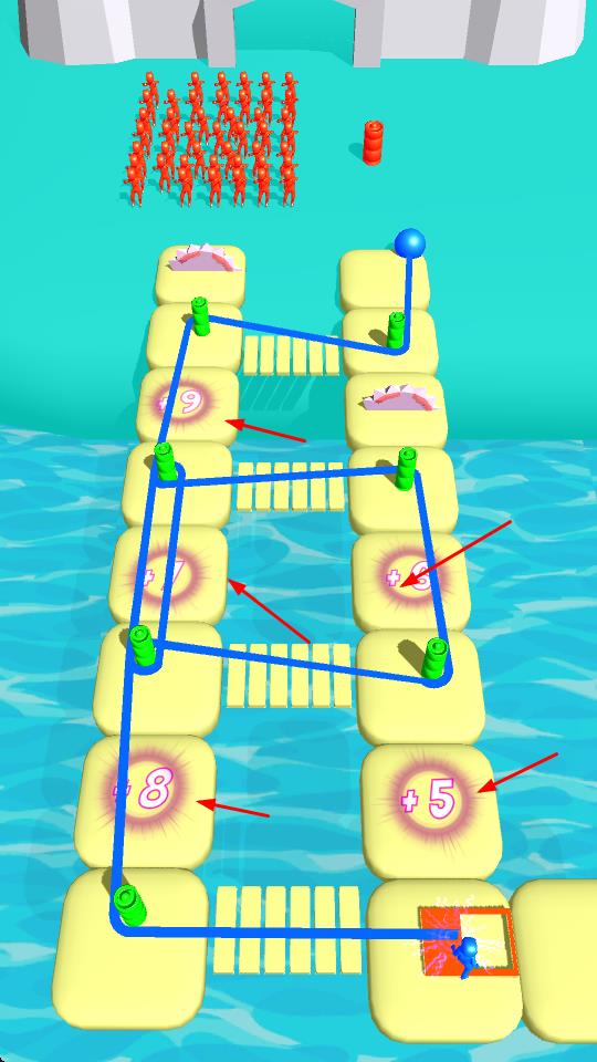 1、在水上迷宫场景中,操控蓝色小人或红色小人,通过滑动屏幕调整移动方向,躲避障碍物,收集资源,积累人数。
