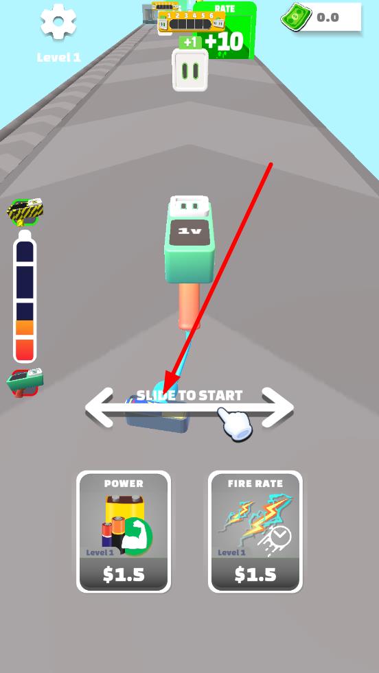 1、进入游戏界面,滑动“SLIDE TO START”启动,精准操控插头在赛道奔跑,留意上方增益效果,优先收集插座维持动力。