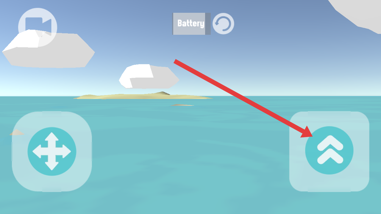 2、飞到海洋场景的上空,可以点击右侧向上箭头按键,加速驱动,快速脱离水域环境,规避无人机掉落。