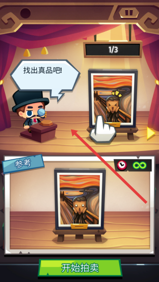 2、参与拍卖鉴定环节,点击开始拍卖,对比上下画作差异,找出与参考图一致的真品,点击对应画作完成鉴定。