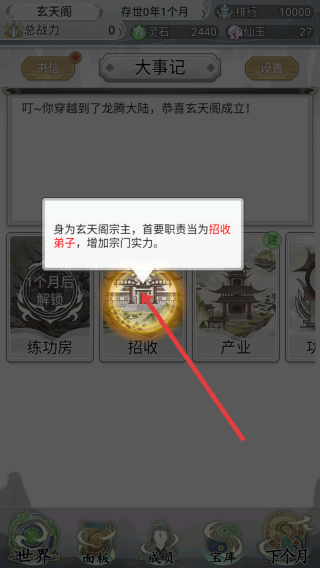 1、进入游戏成为玄天阁宗主后,优先点击招收弟子,履行招收弟子职责,提升宗门实力。