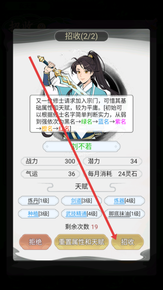 2、在招收界面2,查看修士刘不若属性,依据名字颜色绿名等也可重置属性和天赋,选择招收。