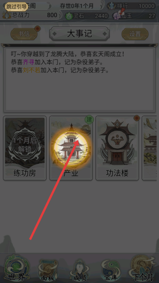 3、成功招收弟子后,可关注大事记的创建,接着点击产业建筑,推进宗门后续发展的建设。