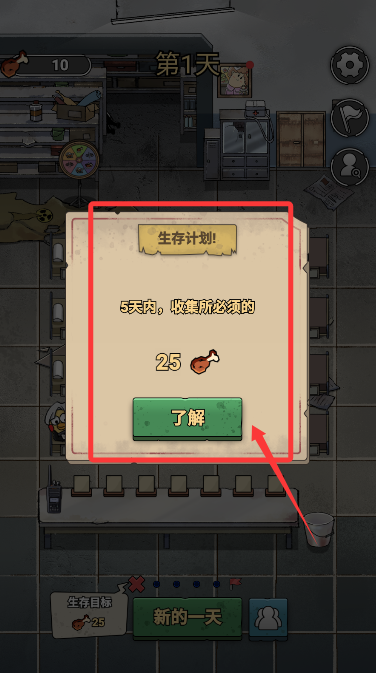 1、开始游戏,查看“生存计划”,明确规定必须5天内收集25鸡腿的目标。