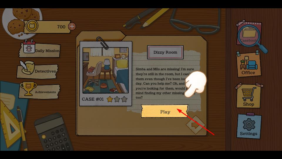 1、进入点击Play按钮开启CASE#01,进入DizzyRoom关卡,接受寻找失踪角色与物品的挑战,开启解谜流程。